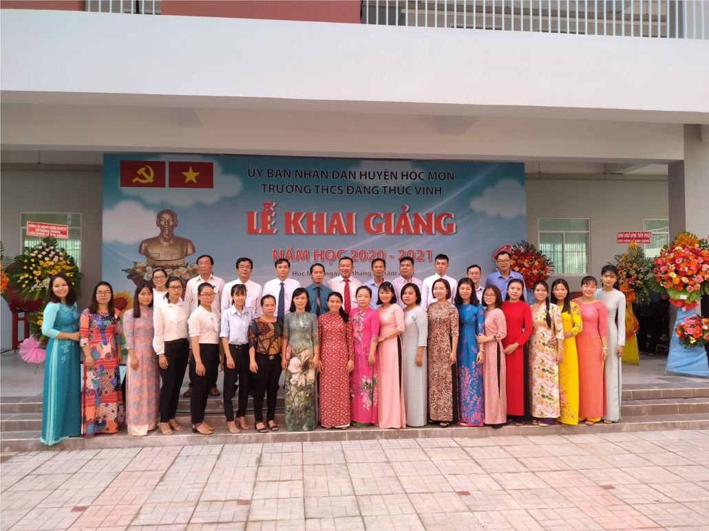 Tập thể CB-GV-NV trường chụp hình kỷ niệm cùng với lãnh đạo phòng Giáo dục và Đào tạo và lãnh đạo địa phương
